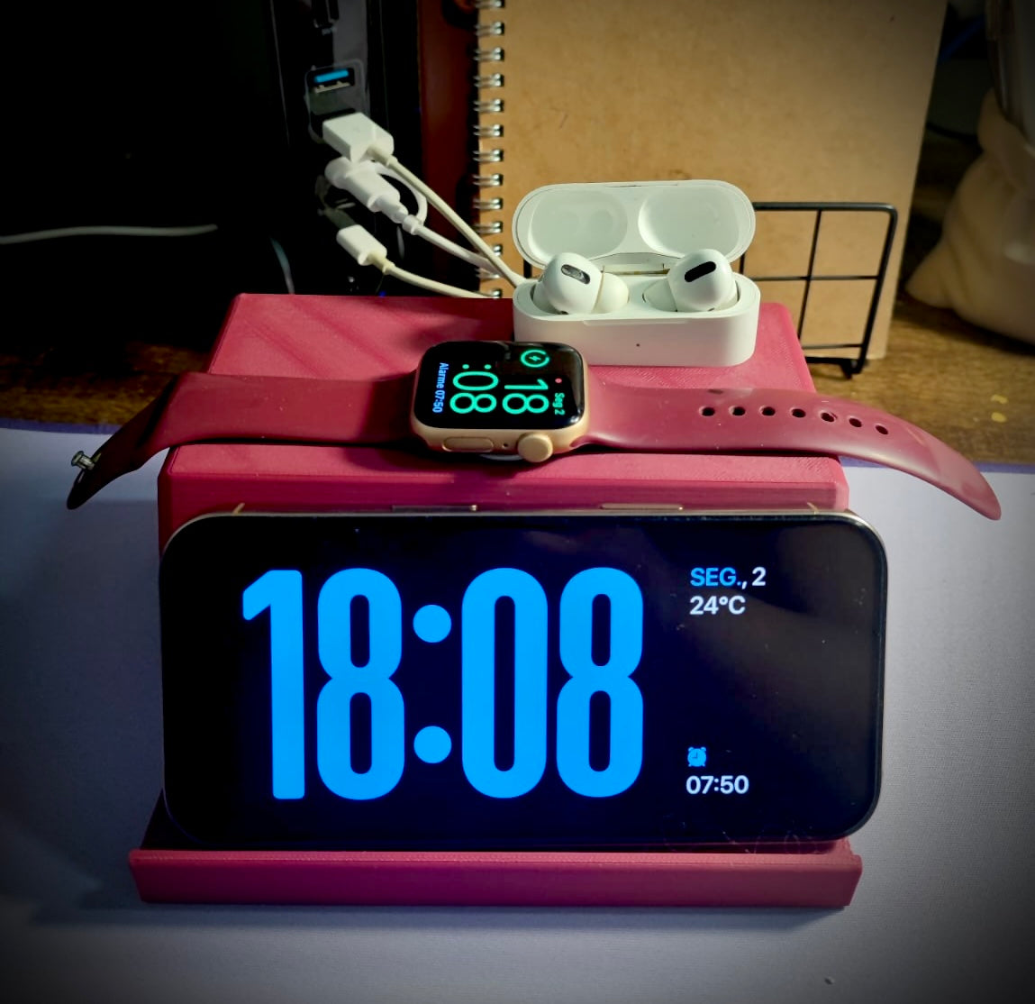 Mantenha seus AirPods, iPhone e Apple Watch carregando num único lugar de forma elegante, reduzindo a bagunça de cabos e otimizando seu espaço.